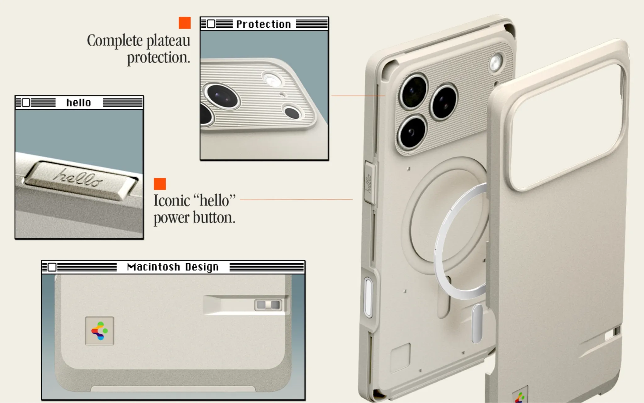 ที่น่าสนใจก็คือ เคส Classic LS MagFit มีฝาปิดสำหรับปุ่มด้านข้าง และปุ่มพาวเวอร์ก็มีตัวอักษร hello ที่เป็นเอกลักษณ์ของ Macintosh