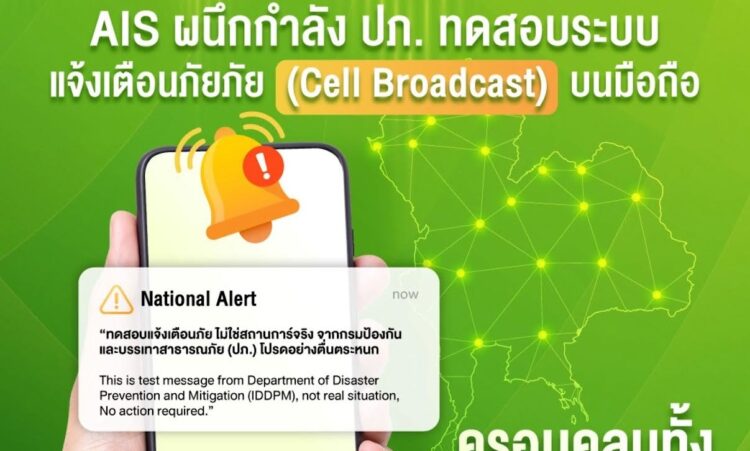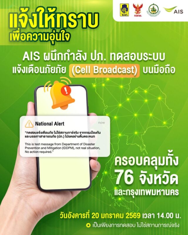 AIS ขอแจ้งให้ประชาชนทราบว่า กรมป้องกันและบรรเทาสาธารณภัย (ปภ.) มีกำหนดทดสอบระบบแจ้งเตือนภัยผ่านโทรศัพท์มือถือด้วยเทคโนโลยี Cell Broadcast ในระดับประเทศ วันจันทร์ที่ 20 มกราคม 2569 เวลา 14.00 น. ครอบคลุมพื้นที่ 76 จังหวัดและกรุงเทพมหานคร เพื่อยืนยันความพร้อมของระบบเตือนภัยระดับชาติให้สามารถส่งข้อความได้รวดเร็ว ครอบคลุม และแม่นยำมากยิ่งขึ้น