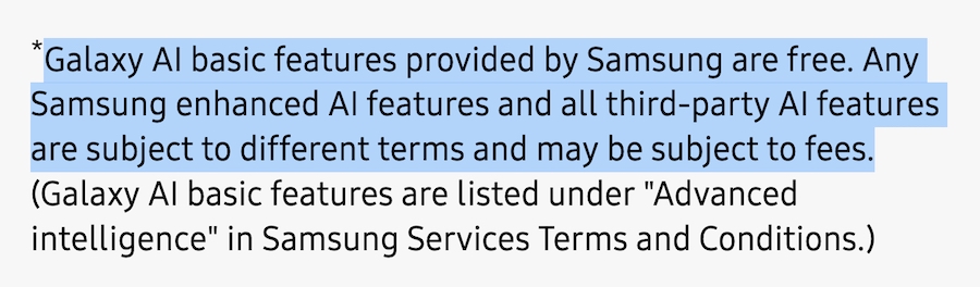 เว็บไซต์ Samsung ในสหรัฐฯ ระบุไว้ในหมายเหตุตอนท้ายของหน้า Galaxy AI ว่า “ฟีเจอร์พื้นฐานของ Galaxy AI ที่ Samsung ให้บริการนั้นฟรี ส่วนฟีเจอร์ AI ขั้นสูงของ Samsung และฟีเจอร์ AI จากผู้ให้บริการรายอื่น ๆ นั้นอยู่ภายใต้ข้อกำหนดและเงื่อนไขที่แตกต่างกัน และอาจมีค่าใช้จ่าย