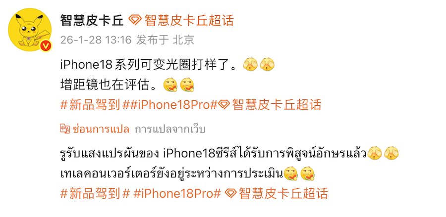 แหล่งข่าวในจีน ที่ใช้ชื่อ Smart Pikachu บนแพลตฟอร์ม Weibo รายงานความคืบหน้าเกี่ยวกับการปรับปรุงกล้องของ iPhone รุ่นใหม่ ที่ดูเหมือนจะมุ่งเน้นไปที่ iPhone 18 Pro และ iPhone 18 Pro Max