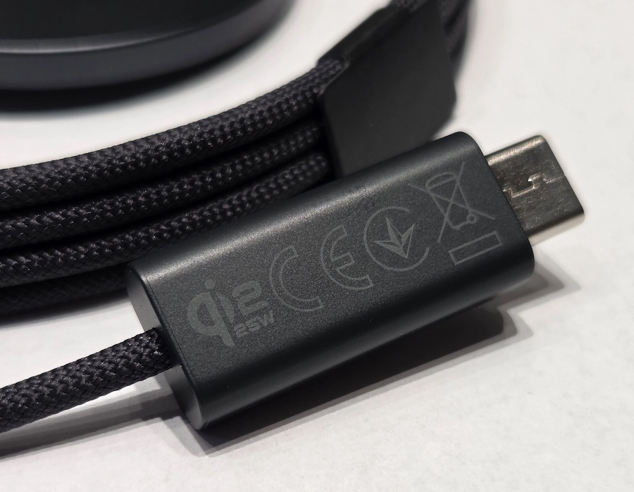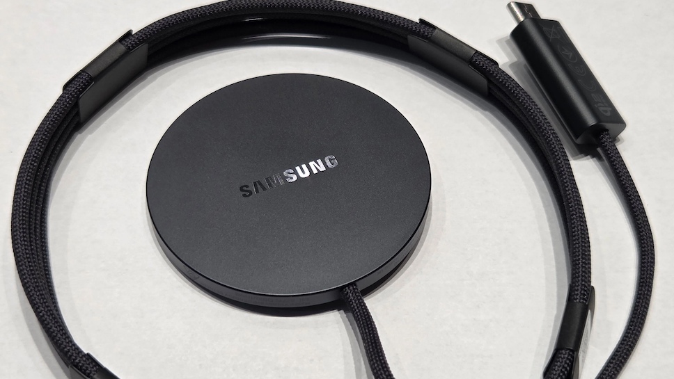 Samsung Magnetic Wireless Charger ใช้สีดำทั้งแท่นชาร์จและสายเคเบิลแบบถัก ปลายสายมีพอร์ต USB Type-C และออกแบบมาให้ใช้งานร่วมกับหัวชาร์จ 45W USB Power Delivery