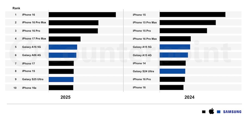 รายงานล่าสุดจาก Counterpoint Research ระบุว่า iPhone 16 เป็นสมาร์ทโฟนขายดีที่สุดในโลก ประจำปี 2025 และสมาร์ทโฟนขายดีที่สุด 10 อันดับ ล้วนมาจากแบรนด์ Apple และ Samsung คิดเป็น 19% ของยอดขายสมาร์ทโฟนโดยรวม