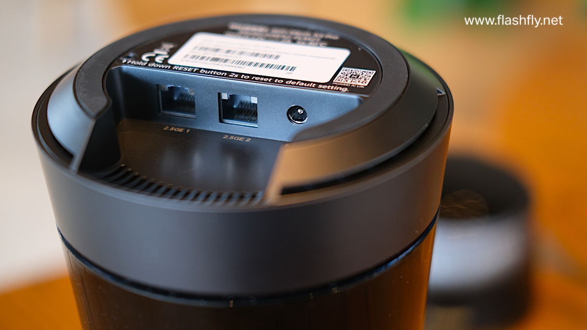 ใต้ฐานของเราเตอร์ตัวหลัก มีพอร์ตเชื่อมต่อสาย LAN หรือ Ethernet สองพอร์ต ความเร็ว 2.5Gbps ใกล้กันเป็นช่องเสียบสายไฟ และมีรูเล็กๆ สำหรับรีเซ็ตอุปกรณ์