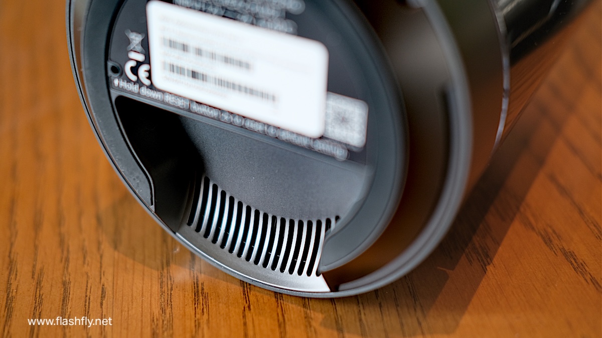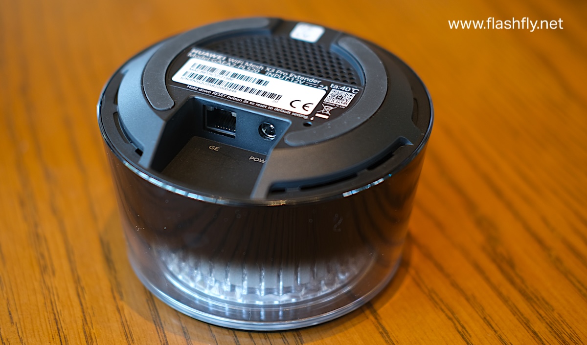 ใต้ฐานของตัวขยายสัญญาณมีพอร์ตเชื่อมต่อสาย LAN เพียงพอร์ตเดียว ความเร็ว 1Gbps ข้างกันเป็นช่องเสียบสายไฟ และมีรูสำหรับรีเซ็ตอุปกรณ์เช่นเดียวกัน