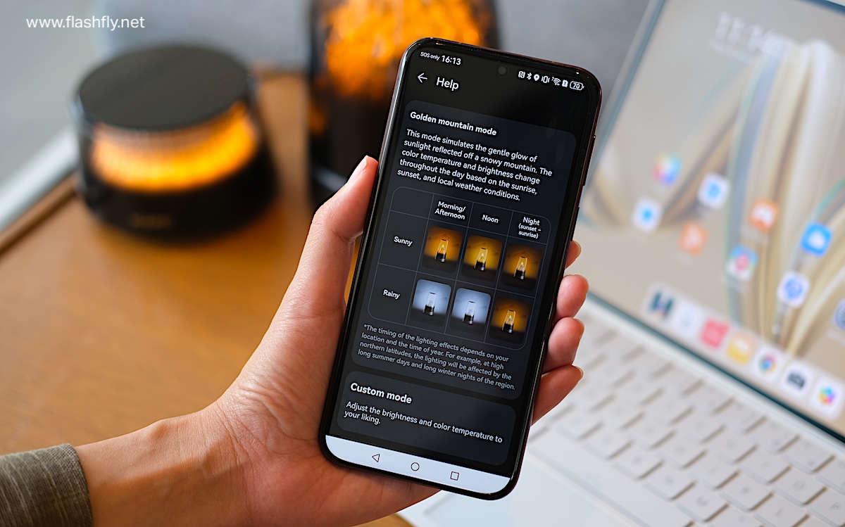 ในส่วนของการตั้งค่า Devices จะสามารถกำหนดค่าเอฟเฟกต์แสงของเราเตอร์ได้ ซึ่งค่าเริ่มต้นกำหนดไว้เป็น Golden Mountain โดยเอฟเฟกต์แสงจะปรับเปลี่ยนโดยอัตโนมัติ ตามช่วงเวลาเช้า กลางวัน หลังพระอาทิตย์ตก และยังปรับเปลี่ยนตามสภาพอากาศด้วย ถ้าหากเป็นวันที่มีฝนตก เอฟเฟกต์แสงก็จะเปลี่ยนจากโทนสีทองเป็นสีขาว