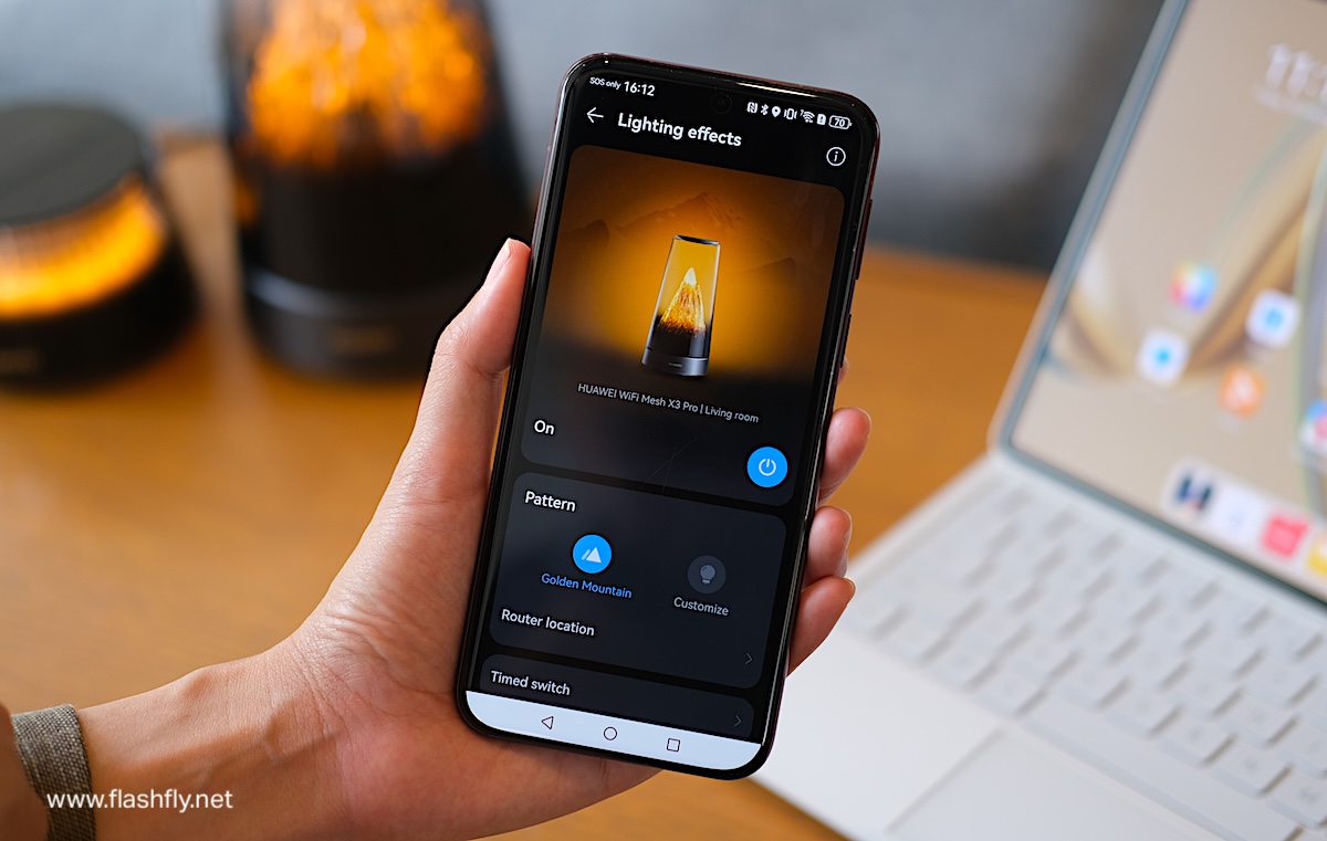 ด้านบนของเราเตอร์ตัวหลักซ่อนเซ็นเซอร์รับการสัมผัสไว้ สำหรับเปิดหรือปิดเอฟเฟกต์แสง ผู้ใช้งานยังสามารถปรับระดับแสง ปรับอุณหภูมิสี และ ตั้งเวลาเปิด-ปิดเอฟเฟกต์แสง ได้จากแอปพลิเคชัน HUAWEI AI Life