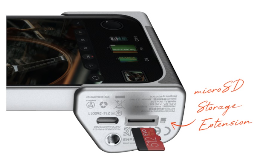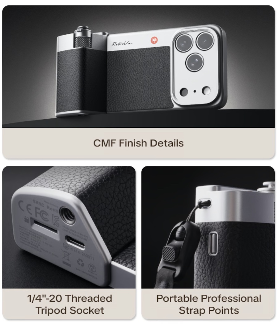 กริปหรือด้ามจับของ RetroVa Vintage Imaging Kit มาพร้อมปุ่มควบคุมต่างๆ เช่น ปุ่มหมุนซูม, ปุ่มชัตเตอร์, ปุ่มมัลติฟังก์ชัน รวมถึงช่องสำหรับติดตั้งขาตั้งกล้อง และยังมีช่องเสียบการ์ด microSD อีกด้วย