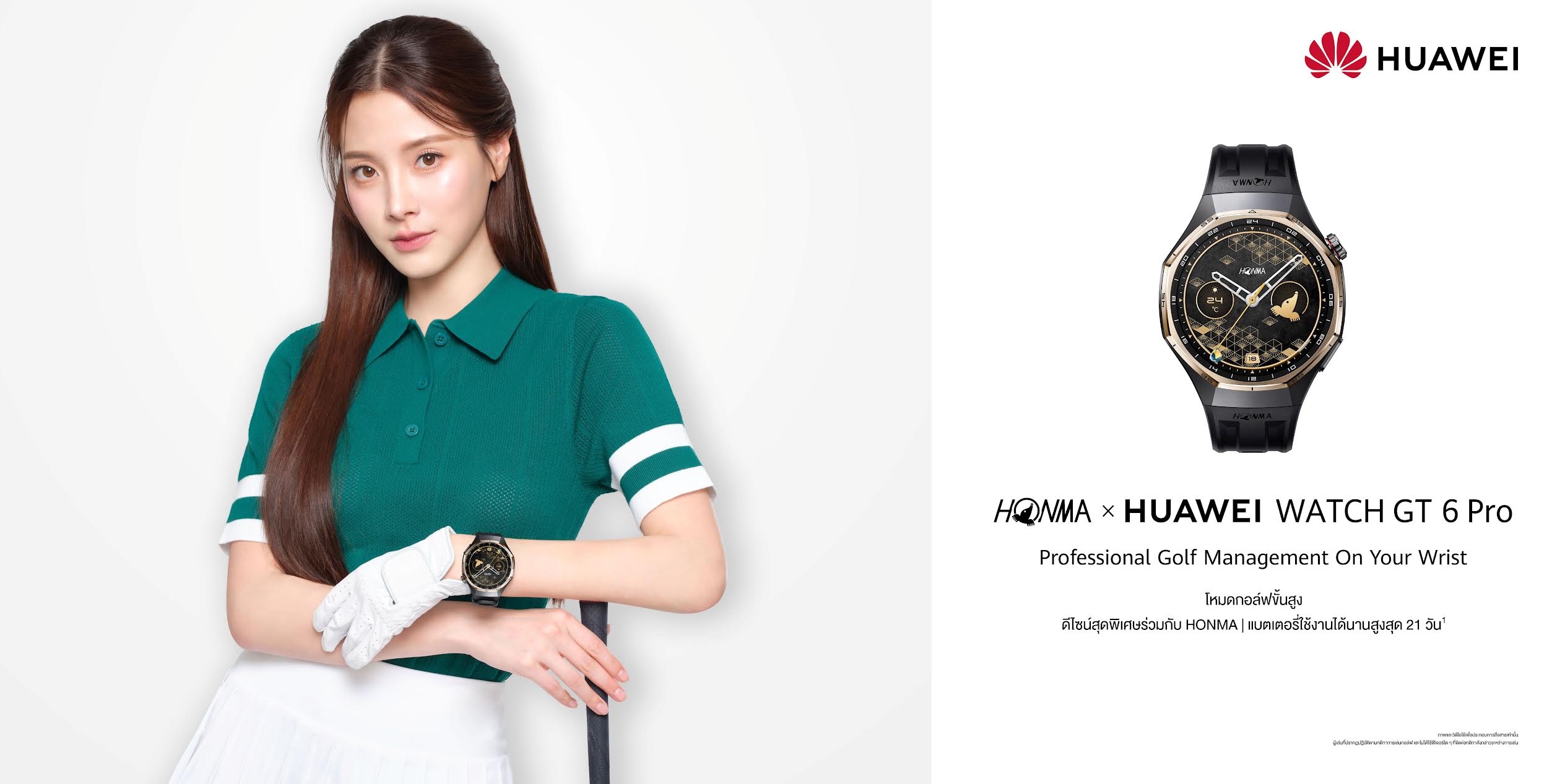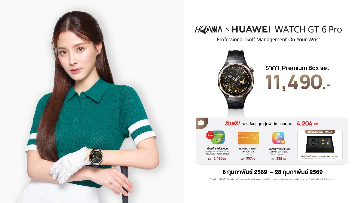 HONMA x HUAWEI WATCH GT 6 Pro พร้อมเป็นเพื่อนคู่ใจนักกอล์ฟในทุกสนาม วางจำหน่ายพร้อม Premium Box set ในราคา 11,490 บาท พิเศษ! เมื่อซื้อระหว่างวันที่ 6 กุมภาพันธ์ 2569 – 28 กุมภาพันธ์ 2569 รับของสมนาคุณสุดพิเศษ รวมมูลค่า 4,204 บาท ได้แก่ ฟีเจอร์กอล์ฟอัลติเมท มูลค่า 3,490 บาท, HUAWEI Health+ Membership มูลค่า 357 บาท, HUAWEI Watch Face Market VIP มูลค่า 338 บาท และชุดของขวัญพิเศษ HONMA ซึ่งประกอบด้วย ลูกกอล์ฟ ไดวอททูล และมาร์ค
