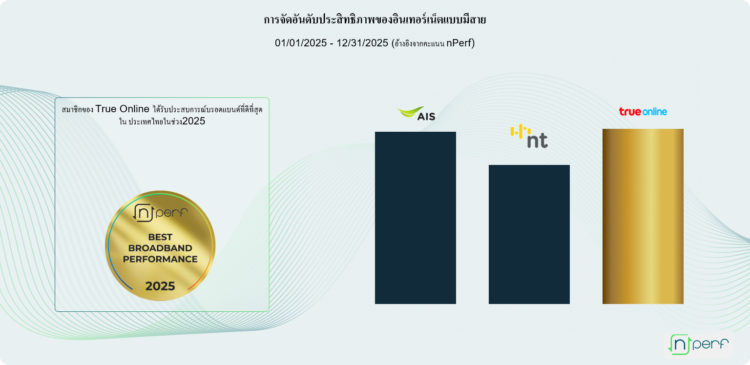 True Online ครองตำแหน่งผู้นำของการจัดอันดับ nPerf ด้วยคะแนน 142,668 nPoints จากการมอบ ความเร็วอินเทอร์เน็ตที่ดีที่สุดในตลาด ทั้งด้านการดาวน์โหลด (332.45 Mb/s) และการอัปโหลด (270.28 Mb/s). ผู้ให้บริการยังทำผลงานได้อย่างยอดเยี่ยมในด้าน การท่องเว็บ (76.13%) และ การสตรีม YouTube (85.60%) พร้อมคงค่า Latency ในระดับที่เหมาะสม (12.49 ms). ผลลัพธ์เหล่านี้ทำให้ True Online กลายเป็นมาตรฐานอ้างอิงสำหรับการใช้งานหนัก การแชร์คอนเทนต์ และการดาวน์โหลดไฟล์ขนาดใหญ่