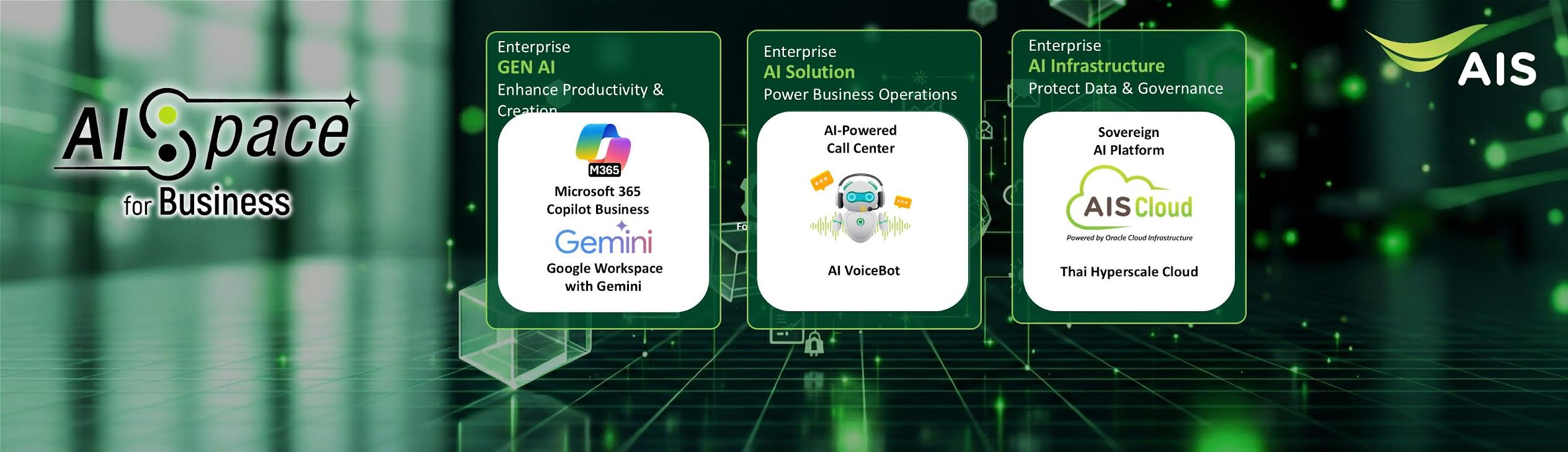 AIS ผู้นำด้านโครงข่ายและเทคโนโลยีดิจิทัลอัจฉริยะของไทย ประกาศก้าวสำคัญในการขับเคลื่อนประเทศด้วย AI เปิดตัว “AISpace” ภายใต้แนวคิด “พื้นที่รวม AI เพื่อคนไทย” ที่แรกและที่เดียวในไทย ที่รวบรวมเทคโนโลยี AI จากพันธมิตรชั้นนำระดับโลก อาทิ SparkChat, Alisa AI, Microsoft 365, BigBot, Replika และ Google Gemini ให้ลูกค้าทุกกลุ่มทั้งบุคคลและองค์กรเลือกใช้งานได้สะดวก ง่าย ครบจบในที่เดียว ในราคาที่เข้าถึงได้ โดยเฉพาะดีลพิเศษสำหรับลูกค้า AIS เท่านั้น พร้อมรองรับการชำระค่าบริการผ่านบิล AIS เพื่อลดอุปสรรคในการเริ่มต้นใช้งาน เดินหน้าสร้าง AI Ecosystem ระดับประเทศ เพื่อยกระดับคุณภาพชีวิต เสริมศักยภาพภาคธุรกิจ และเร่งเศรษฐกิจดิจิทัลไทยให้เติบโตอย่างยั่งยืน ท่ามกลางยุคที่ AI กำลังเปลี่ยนผ่านทุกอุตสาหกรรม AIS เชื่อว่า AI คือโครงสร้างพื้นฐานแห่งอนาคต ซึ่งการนำไปใช้จริงในวงกว้างต้องอาศัยการเชื่อมต่อที่มีคุณภาพและโครงข่ายที่พร้อมรองรับ จึงพัฒนา AI-Powered Network Ecosystem ผสานโครงข่ายอัจฉริยะกับนวัตกรรมดิจิทัล เพื่อให้คนไทยเข้าถึงประสบการณ์ AI ที่มีประสิทธิภาพ ปลอดภัย และเหมาะกับบริบทการใช้งานในประเทศไทยอย่างแท้จริง
