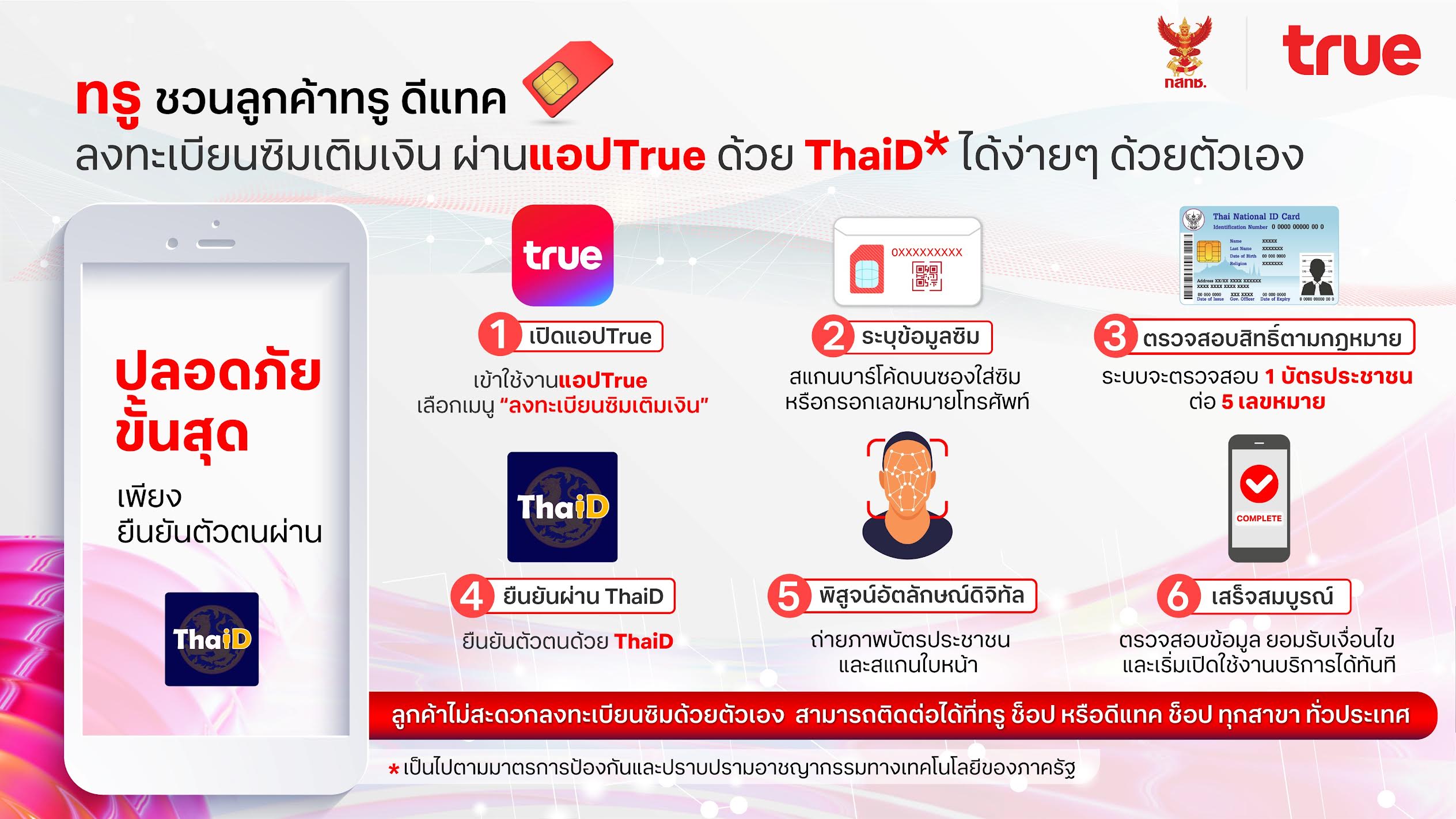 จากมาตรการป้องกันและปราบปรามอาชญากรรมทางเทคโนโลยี ของภาครัฐที่ร่วมบูรณาการพลังจากทุกภาคส่วน เพื่อยกระดับการป้องกันภัยคุกคามทางไซเบอร์ให้สามารถดำเนินการได้อย่างมีประสิทธิภาพ ทรู คอร์ปอเรชั่น พร้อมขานรับและปฏิบัติตามนโยบายอย่างเคร่งครัด เพื่อปกป้องสิทธิ์และคุ้มครองข้อมูลส่วนบุคคลสูงสุด โดยให้ตัวแทนจำหน่ายทั่วประเทศจะต้องมีการลงทะเบียนซิมด้วยเครื่องอ่านบัตรประชาชน (Smart Card Reader) และอำนวยความสะดวกให้ลูกค้าสามารถลงทะเบียนซิมเติมเงินได้ด้วยตัวเองง่ายๆ ทุกที่ ทุกเวลา ผ่านแอปTrue ที่จะยืนยันตัวตนด้วยThaiD ซึ่งจะช่วยเพิ่มความปลอดภัยในการใช้งาน เป็นเกราะป้องกันภัยจากมิจฉาชีพที่แข็งแกร่ง พร้อมมอบประสบการณ์ดิจิทัลที่ใช้งานง่าย เชื่อถือได้ และมั่นใจได้เสมือนการติดต่อทำรายการด้วยตนเองที่ช็อป ลูกค้าทรู ดีแทค เริ่มใช้งานได้แล้ววันนี้