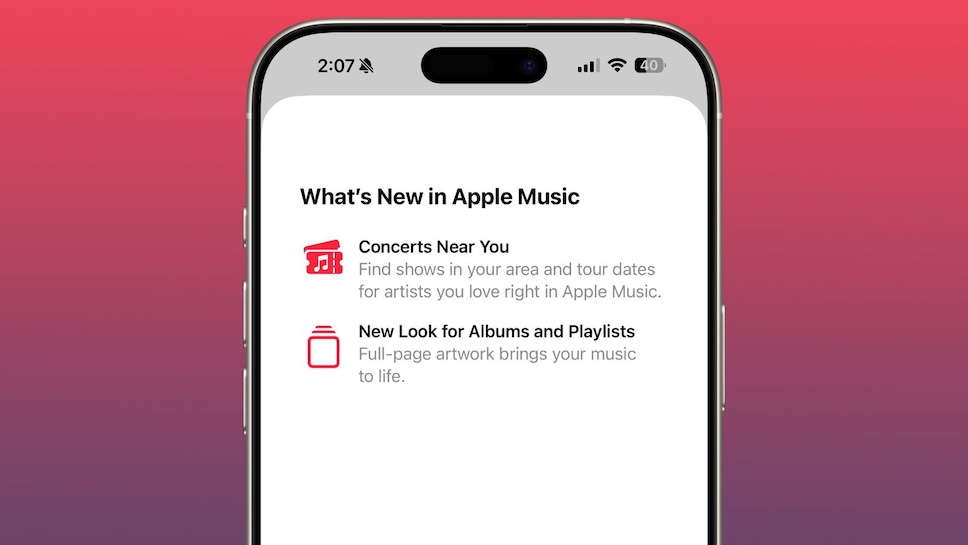 Apple Music เพิ่มภาพปกแบบเต็มหน้าจอ ขณะที่อัลบั้มและเพลย์ลิสต์ได้รับการออกแบบใหม่ และยังมีฟีเจอร์ Concerts Near You ช่วยให้ผู้ใช้งานสามารถค้นหาคอนเสิร์ตในพื้นที่ใกล้เคียง และตารางทัวร์ของศิลปินที่ชื่นชอบได้