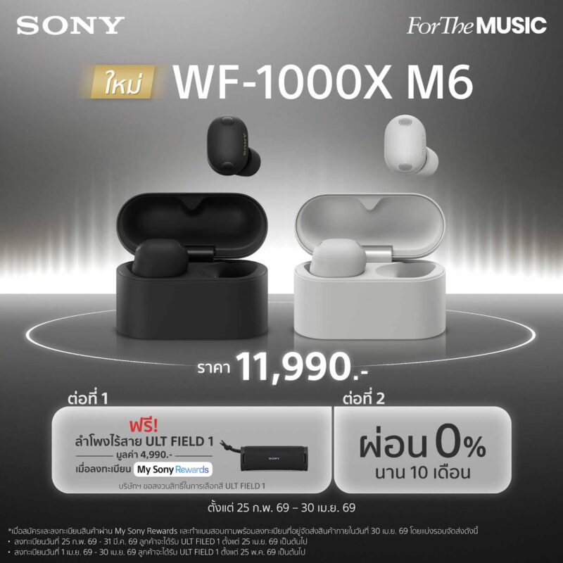 WF-1000XM6 พร้อมวางจำหน่ายอย่างเป็นทางการตั้งแต่วันที่ 25 กุมภาพันธ์ 2569 ในราคา 11,990 บาท โดยมีให้เลือกทั้งหมด 2 สี ได้แก่ สีดำ (Black) และสีแพลตตินัมซิลเวอร์ (Platinum Silver) พร้อมโปรโมชั่นพิเศษ รับฟรีลำโพงพกพาโซนี่ ULT FIELD 1 มูลค่า 4,990 บาท เมื่อซื้อหูฟัง WF-1000XM6 และลงทะเบียนรับประกันสินค้า My Sony ผ่านไลน์ @SonyThai พร้อมตอบแบบสอบถามที่จะได้รับทางอีเมลหลังการลงทะเบียนรับประกันสินค้าภายในวันเดียวกัน ตั้งแต่วันที่ 25 กุมภาพันธ์ 2569 – 30 เมษายน 2569