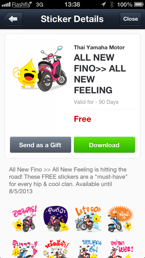 Yamaha Motor ประเทศไทยได้เขาร่วมกระแส Social Media กับแอพแชตสุดฮิตอย่าง LINE ด้วยการเจาะกลุ่มวัยรุ่นแจกสติ๊กเกอร์ All New Fino >> All New Felling ฟรีสำหรับผู้ใช้งาน iPhone และ Android เพื่อเป็นการโปรโมทรถจักรยานยนตร์ Fino รุ่นใหม่ สามารถดาวน์โหลดได้ฟรีที่ Sticker Shop แล้ววันนี้