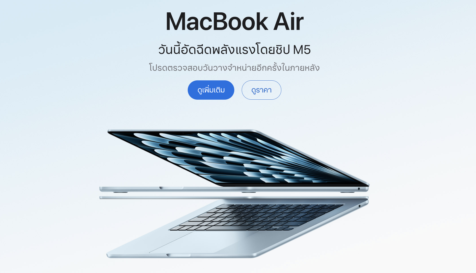 ลูกค้าสามารถสั่งซื้อ MacBook Air รุ่น 13 นิ้ว และ 15 นิ้วใหม่ พร้อมชิป M5 ได้ทาง apple.com/th/store และแอป Apple Store โดยทุกรุ่นจะเริ่มจัดส่งถึงลูกค้าและวางจำหน่ายใน Apple Store รวมถึงตัวแทนจำหน่ายที่ได้รับอนุญาตของ Apple ในประเทศไทยเร็วๆ นี้