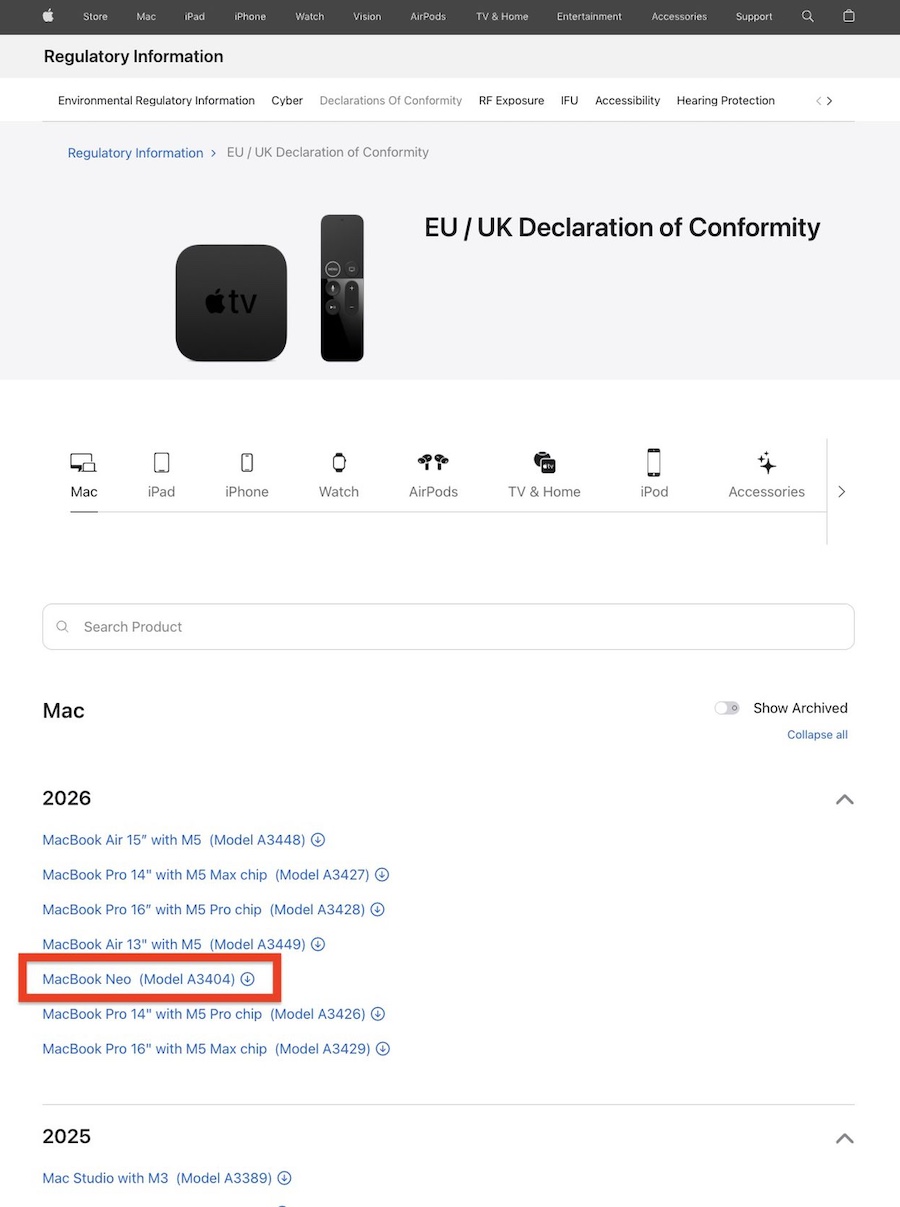 ชื่อของ MacBook Neo ปรากฏขึ้นบนเว็บไซต์ด้านกฎระเบียบของ Apple ก่อนจะถูกลบไปในเวลาต่อมา ทำให้เชื่อว่าอาจเป็นชื่อเรียกทางการของ MacBook รุ่นประหยัด