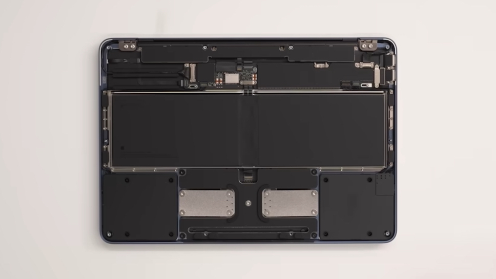 เมื่อถอดฝาด้านล่างของ MacBook Neo ออกไปแล้ว จะพบกับแบตเตอรี่ ลำโพงสเตอริโอ และแทร็กแพดแบบคลิกเชิงกลแบบใหม่ ซึ่งเป็นแผ่นโลหะที่ลอยอยู่เหนือปุ่มตรงกลาง