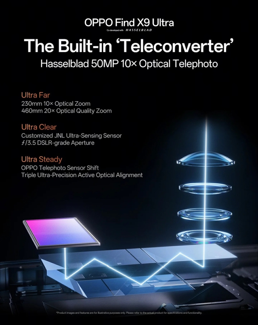 กล้อง Telephoto แบบ Periscope ของ OPPO Find X9 Ultra ใช้เซ็นเซอร์ Samsung Isocell JNL ที่ปรับแต่งมาเป็นพิเศษ ขนาดรูรับแสง f/3.5 ระดับ “DSLR” พร้อมระบบกันสั่น OIS แบบเลื่อนเซ็นเซอร์ และระบบจัดตำแหน่งแสงแบบแอคทีฟความแม่นยำสูง 3 ชั้น ทำให้กล้องตัวนี้ “นิ่งเป็นพิเศษ” นอกจากนี้ ยังใช้โครงสร้างปริซึมสะท้อนแสง 5 ชั้น แบบแรกที่มีสถาปัตยกรรมเส้นทางแสงที่บริสุทธิ์