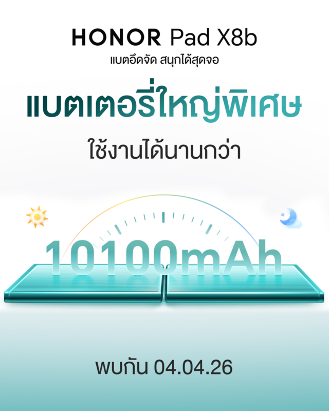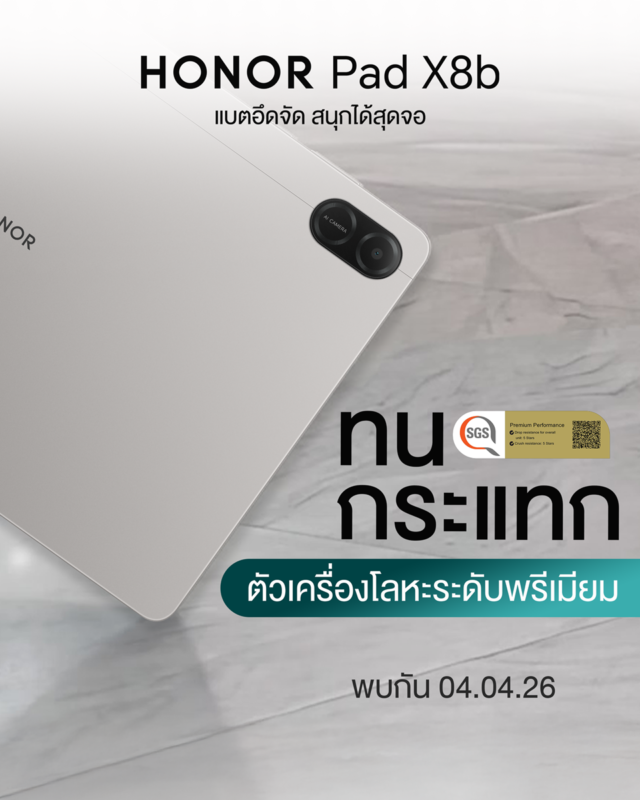 ออเนอร์ (HONOR) ผู้นำด้านอุปกรณ์อัจฉริยะระดับโลก เดินหน้าเขย่าตลาดแท็บเล็ตอีกครั้งด้วยการเตรียมเปิดตัว HONOR Pad X8b ชูคอนเซปต์ “แบตอึดจัด สนุกได้สุดจอ”                  ที่ผสานทั้งดีไซน์พรีเมียมและประสิทธิภาพไว้อย่างลงตัว เพื่อตอบโจทย์การใช้งานในทุกมิติ ไม่ว่าจะเป็นนักเรียน นักศึกษา คนทำงานรุ่นใหม่ หรือสายฟรีแลนซ์ที่ต้องการอุปกรณ์คู่ใจเพียงเครื่องเดียว ครบทั้งเรียน ทำงาน               และความบันเทิง โดดเด่นด้วยหน้าจอ HONOR Eye Comfort FullView ขนาด 11 นิ้ว เสริมความอึดด้วยแบตเตอรี่ความจุ 10,100mAh ที่พร้อมลุยได้ตลอดวัน พร้อมโครงสร้างตัวเครื่องโลหะระดับพรีเมียม แข็งแรงทนทาน ผ่านการรับรองมาตรฐานความแกร่งระดับ 5 ดาวจาก SGS ประเทศสวิตเซอร์แลนด์ เตรียมเผยราคาอย่างเป็นทางการในประเทศไทยวันที่ 4 เมษายน 2569 พร้อมรับโปรโมชันและข้อเสนอพิเศษมากมาย