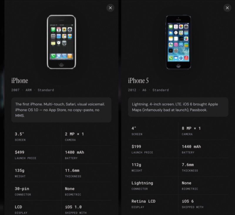นอกจากนี้ ยังให้รายละเอียดเกี่ยวกับสีสันทั้งหมดของ iPhone ทุกรุ่นที่เคยเปิดตัว จากนั้นแสดงการ์ดแยกสำหรับแต่ละรุ่น พร้อมข้อมูลทางเทคนิค เช่น ขนาดหน้าจอ ความจุแบตเตอรี่ โปรเซสเซอร์ กล้อง และอื่นๆ