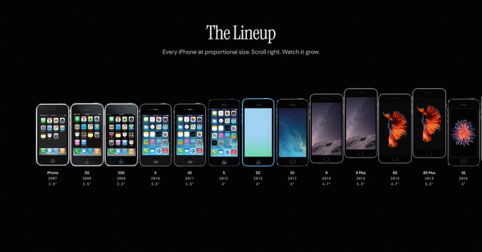 ข้อมูลแบบอินเทอร์แอคทีฟ Every iPhone Ever Made นำเสนอในรูปแบบไทม์ไลน์แบ่ง เริ่มต้นด้วย iPhone ทุกรุ่นที่เคยออกวางจำหน่าย แสดงเคียงข้างกันในขนาดที่ได้สัดส่วน โดยแต่ละรุ่นมีวอลเปเปอร์ดั้งเดิม ชื่อ ขนาด และปีที่วางจำหน่าย