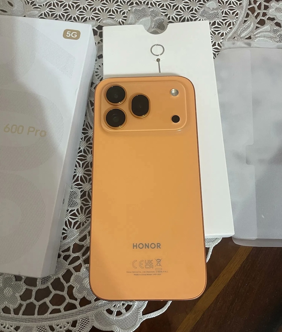 ภาพหลุด HONOR 600 Pro เผยให้เห็นดีไซน์ด้านหน้าและด้านหลังอย่างชัดเจน มาในตัวเครื่องสีส้ม และแถบกล้องหลังขนาดใหญ่ที่ดูคล้าย iPhone 17 Pro ส่วนกล้องเซลฟี่ซ่อนอยู่ในรูเล็กๆ บนหน้าจอ
