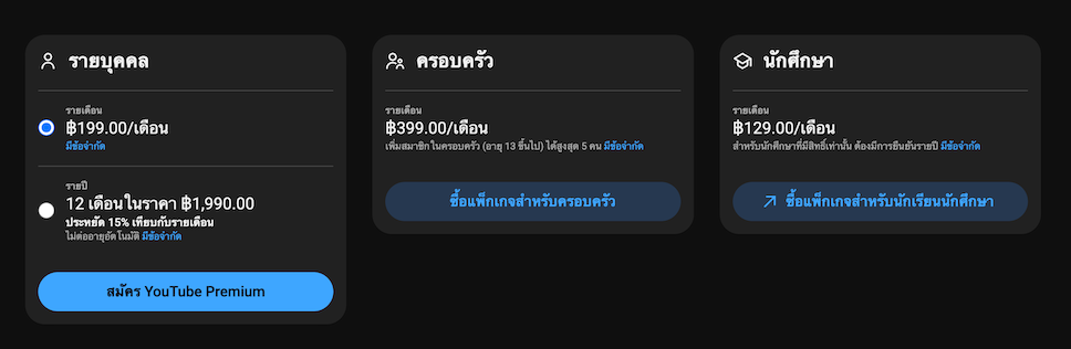 YouTube ประเทศไทย ขึ้นค่าบริการสมาชิกระดับ Premium และ Premium Lite โดยมีผลทันทีสำหรับการสมัครสมาชิกใหม่ ส่วนสมาชิกเดิมจะต้องจ่ายตามราคาใหม่ในรอบบิลถัดไป
