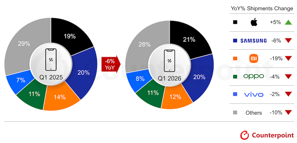 Counterpoint Research รายงานการจัดส่งสมาร์ตโฟนทั่วโลก ในช่วงไตรมาสแรกของปี 2026 ซึ่งพบว่า Apple ขึ้นเป็นผู้นำในไตรมาสแรกได้เป็นครั้งแรก