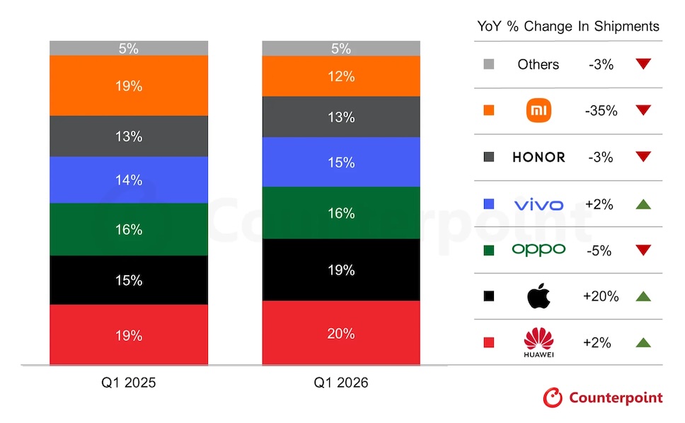 รายงานก่อนหน้านี้ของ Counterpoint Research ชี้ให้เห็นว่า Apple ครองอันดับ 1 ในไตรมาสแรกของปี 2026 เป็นแบรนด์ที่ครองส่วนแบ่งมากที่สุดในตลาดโลก และรายงานใหม่จาก Counterpoint ได้เจาะลงไปที่ตลาดสมาร์ตโฟนของประเทศจีน