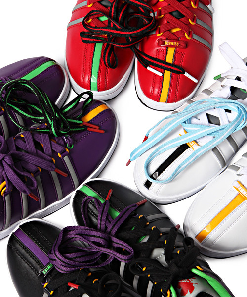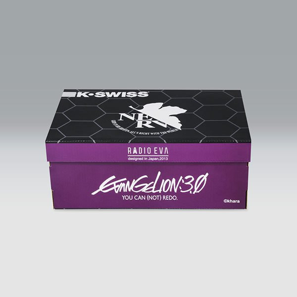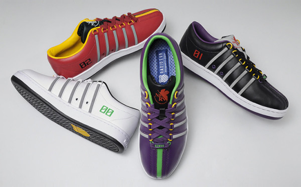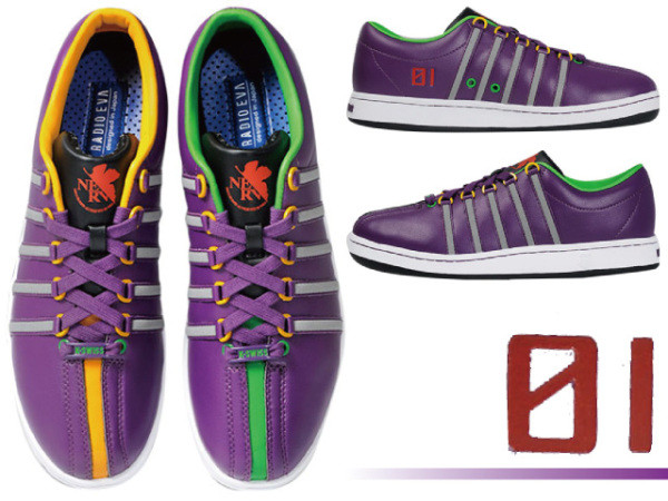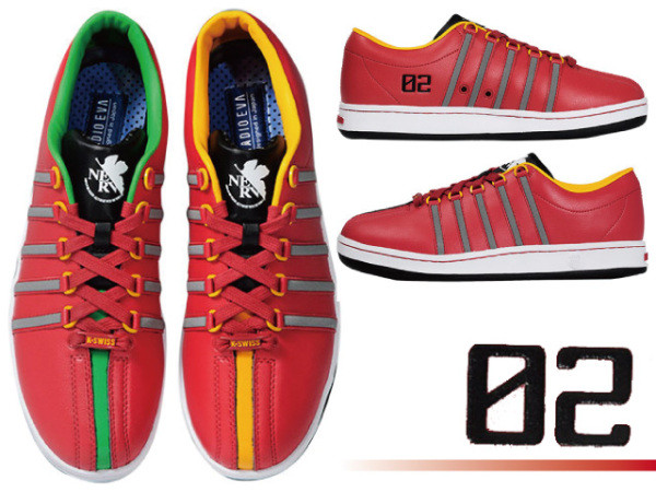 เป็นการจับมือกันระหว่าง Radio EVA กับทาง K-Swiss ผู้ผลิตรองเท้าชื่อดังจากอเมริกา เอาการ์ตูนยอดนิยมอย่าง Evangelion มาผสมผสานทำเป็นรองเท้ารุ่นพิเศษสุดคลาสสิกมีให้เลือกกัน 4 สี 4 สไตส์ มาพร้อมกับกล่องใส่รองเท้างามๆลาย Evangelion 3.0 : You Can (Not) Redo เห็นแล้วน่าซื้อมาใส่ซะจริงๆ ในบ้านเราเห็นมีหลายเว็บรับสั่งของอยู่เหมือนกัน สนนราคาคู่ละ 10,290 เยน (ประมาณ 3,090 บาท)