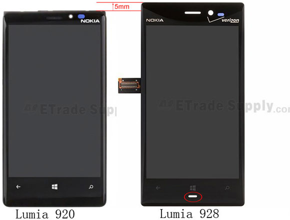 จากภาพจะเห็นว่า Lumia 928 มีขนาดสูงกว่า Lumia 920 อยู่ 5 มม. และมี Microphone อยู่ด้านล่าง