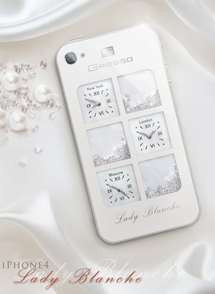 โดย iPhone 4 สีขาวสุดพิเศษนี้เป็นอีกหนึ่งผลงานชิ้นเอกจาก Gresso ที่มีชื่อว่า Lady Blanche Diamonds ซึ่งตกแต่งด้วยเพชรแท้เคลือบด้วยแร่ธาตุพิเศษ นาฬิกาสุดหรูจากสวิสเซอร์แลนด์ถึง 3 เรือน และไข่มุกแสนสวย ส่วนสนนราคาสำหรับ iPhone 4 สีขาวฝังเพชร หรือ Lady Blanche Diamonds นี้มีราคาอยู่ที่ 30,000$ หรือประมาณ 900,000 บาท แต่หากใครที่ไม่นิยมชมชอบเพชรทาง Gresso ก็ได้มีการจัดจำหน่ายอีกรุ่นในชื่อ Lady Blanche Crystals ซึ่งจะใช้คริสตัลเป็นวัสดุแทนเพชร ในราคาที่ถูกกว่าเพียง 7,000$ หรือประมาณ 210,000 บาทเท่านั้น เรียกว่าเป็นอีกหนึ่งสีสันของ iPhone ที่มักจะมีมาให้ตื่นเต้นกันอยู่เสมอ