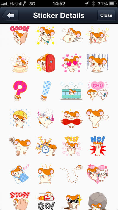 วันนี้ LINE ได้วางจำหน่ายสติ๊กเกอร์ใหม่อีก 6 แบบโดยสำหรับในประเทศไทยจะซื้อได้เพียง 4 แบบเท่านั้น ซึ่งมีการ์ตูนดังในประเทศญี่ปุ่นอย่าง Hamtaro และ Perry Agent P จาก Disney อีกด้วยส่วนที่เหลือจะเป็นของ Meow Me 3 และ Shin Naniwa Kinyuudo Series