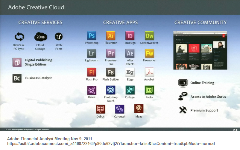 นอกจากนี้ อะโดบียังเปิดเผยว่าบริษัทฯ จะมุ่งเน้นการพัฒนาซอฟต์แวร์ครีเอทีฟบน Creative Cloud แม้ว่าผลิตภัณฑ์ Adobe Creative Suite® 6 จะยังคงได้รับการสนับสนุนและมีวางจำหน่ายต่อไป แต่บริษัทฯ ไม่มีแผนที่จะวางจำหน่าย Creative Suite อีกต่อไป หรือผลิตภัณฑ์ CS อื่นๆ โดยวิคกี้ สกิ๊ปป์ อธิบายว่า “การทุ่มเทให้กับการพัฒนา Creative Cloud ไม่เพียงช่วยให้อะโดบีสามารถสร้างสรรค์นวัตกรรมได้รวดเร็วมากขึ้น แต่ยังขยายขอบเขตการสร้างสรรค์เทคโนโลยีใหม่ๆ ให้แก่ชุมชนครีเอทีฟ”