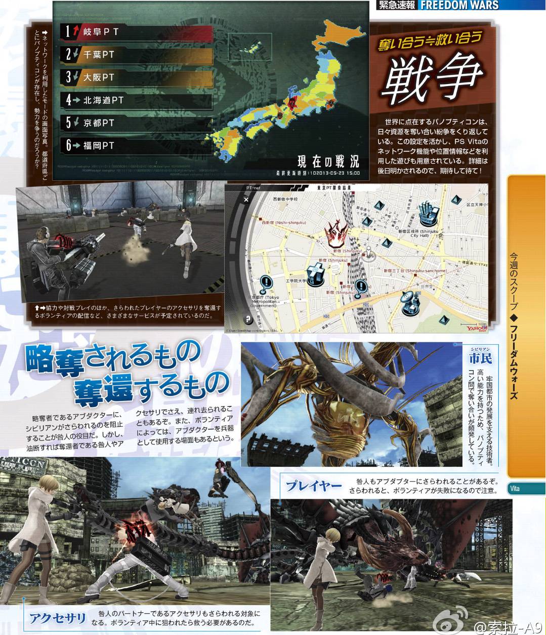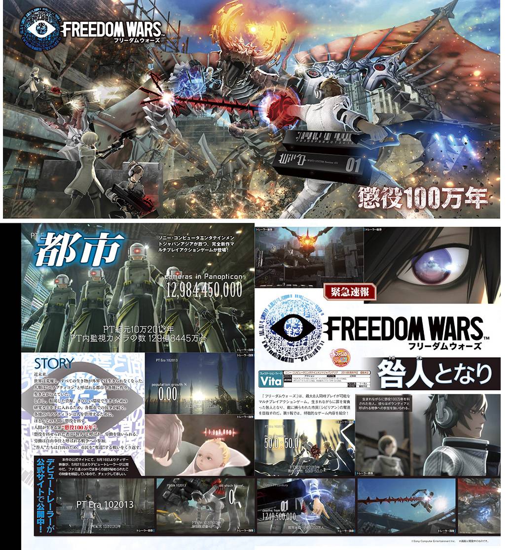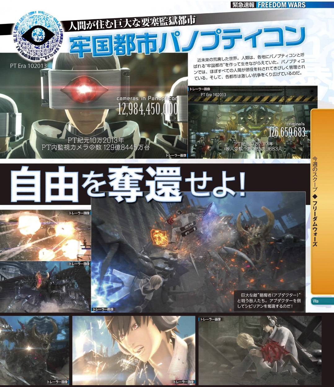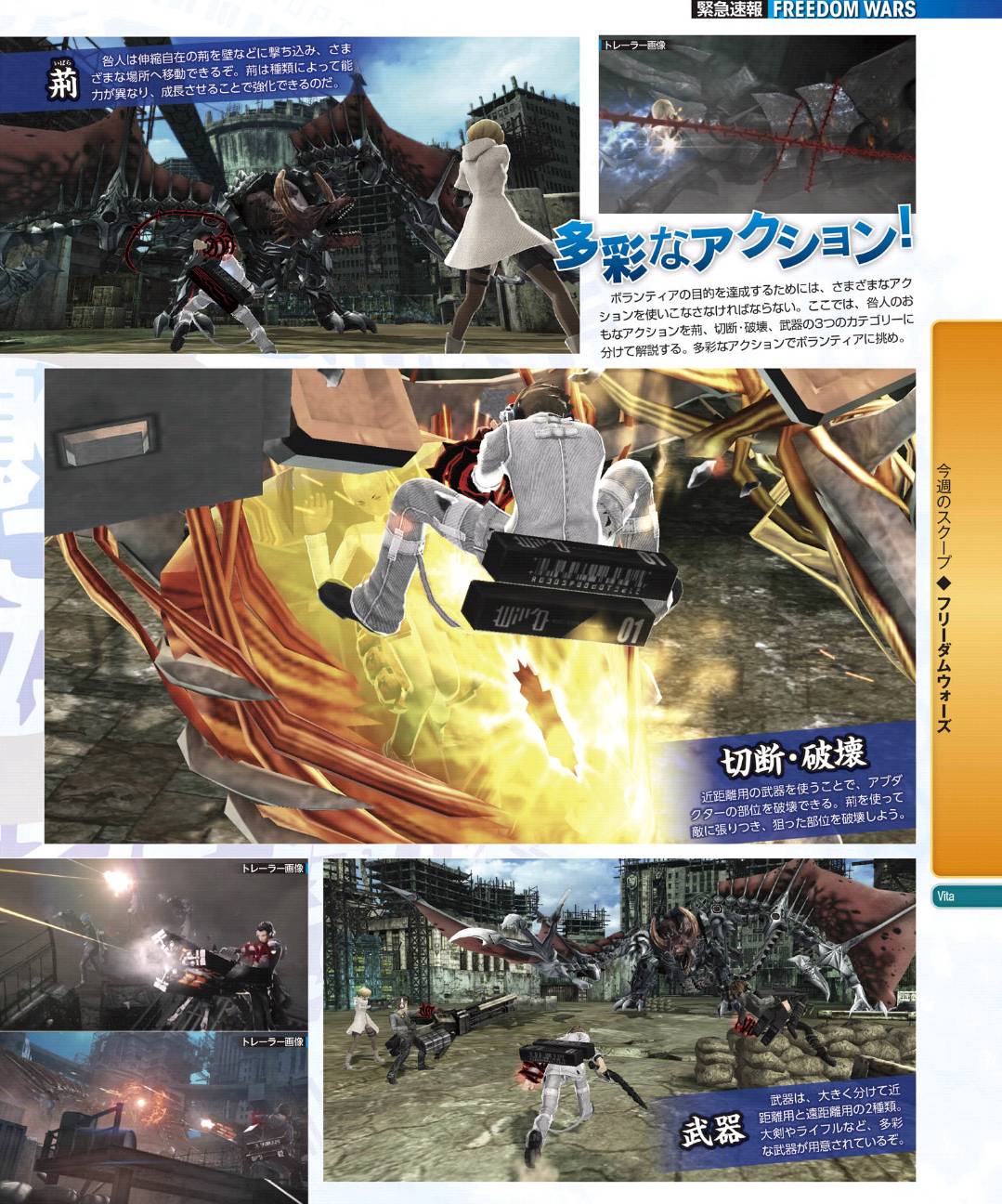 หลังจากที่ทาง Sony Computer Entertainment Japan ได้เปิดเผยข้อมูลและปล่อยเทรลเลอร์ของเกมออกมายั่วเหล่าบรรดาแฟนๆไปก่อหน้านี้ ว่าเกม Freedom Wars จะเป็นเกมแนวล่ามอนสเตอร์แบบ Multiplayer Action ที่รองรับผู้เล่นได้สูงสุดถึง 8 คนด้วยกัน ล่าสุดได้มีภาพสแกนจากนิตยสารเกมของญี่ปุ่นออกมาให้ได้ชมกันแล้ว จากภาพสแกนชุดนี้จะทำให้ผู้เล่นได้เห็นรายระเอียดต่างๆภายในเกมมากยิ่งขึ้น ลองรับชมกันดู