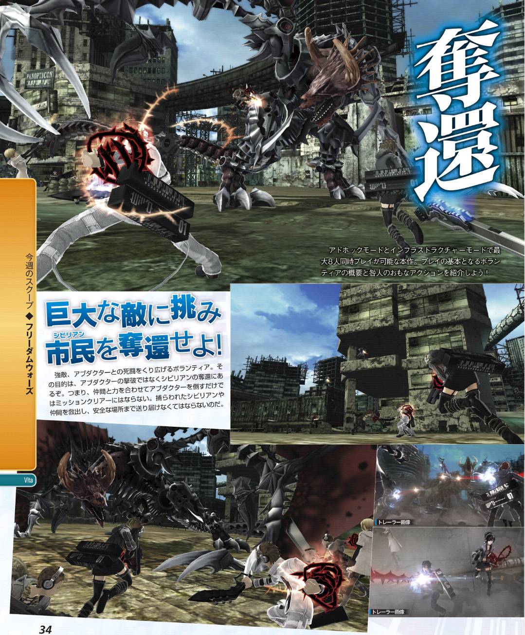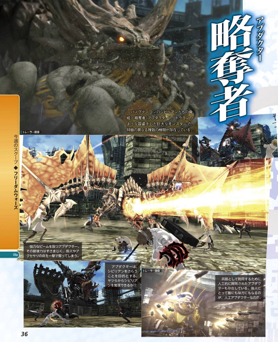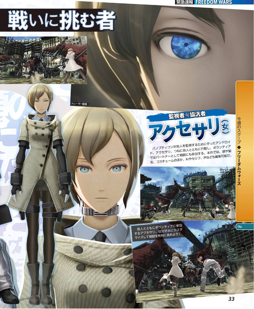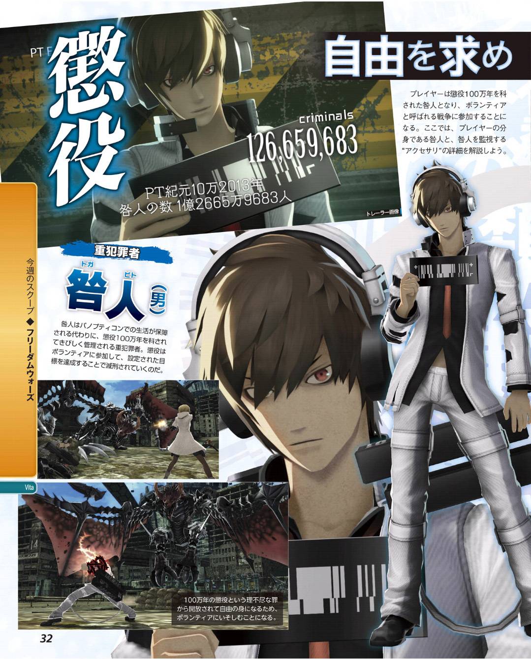หลังจากที่ทาง Sony Computer Entertainment Japan ได้เปิดเผยข้อมูลและปล่อยเทรลเลอร์ของเกมออกมายั่วเหล่าบรรดาแฟนๆไปก่อหน้านี้ ว่าเกม Freedom Wars จะเป็นเกมแนวล่ามอนสเตอร์แบบ Multiplayer Action ที่รองรับผู้เล่นได้สูงสุดถึง 8 คนด้วยกัน ล่าสุดได้มีภาพสแกนจากนิตยสารเกมของญี่ปุ่นออกมาให้ได้ชมกันแล้ว จากภาพสแกนชุดนี้จะทำให้ผู้เล่นได้เห็นรายระเอียดต่างๆภายในเกมมากยิ่งขึ้น ลองรับชมกันดู