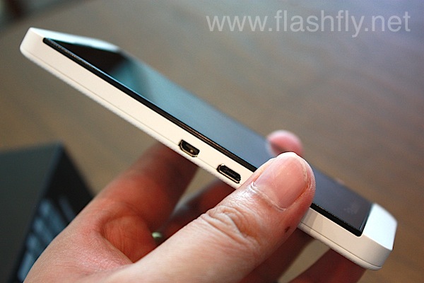 ด้านซ้ายมีพอร์ท micro HDMI และช่อง Micro USB สำหรับชาร์จไฟและเชื่อมต่อคอมพิวเตอร์ด้วยซอฟต์แวร์ BlackBerry Link