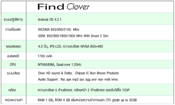ที่กล่าวมาทั้งหมดเป็นคุณสมบัติคร่าวๆ ของ OPPO Find Clover ที่ยังมีความสามารถตอบสนองการใช้งานของคุณได้อย่างครบครันไม่ว่าจะเป็นเรื่องงาน หรือ ความบันเทิง ทั้งนี้ผู้ที่สนใจสามารถหาเป็นเจ้าของ OPPO Find Clover ได้แล้ววันนี้ ในราคา 8,990 บาท