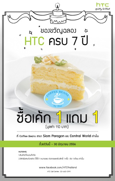 เอชทีซีมอบของขวัญสุดพิเศษฉลองครบ 7 ปีกับโปรโมชั่นเด็ดที่ร้าน Coffee Beans ด้วยสิทธิพิเศษซื้อเค้ก 1 ชิ้นแถม 1 ชิ้นตลอดเดือนมิถุนายนนี้