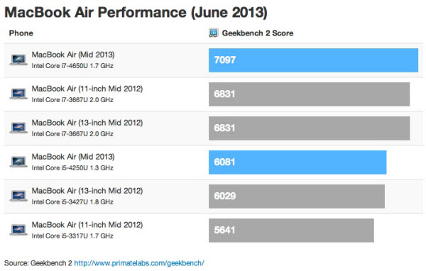 ล่าสุด ได้มีผลการทดสอบออกมาโดย Geekbench 2 แสดงให้เห็นถึงประสิทธิภาพการทำงาน ที่เพิ่มขึ้นมาประมาณ 3-8% บน MacBook Air รุ่นใหม่ เมื่อเทียบกับรุ่นเดิมก่อนหน้านี้