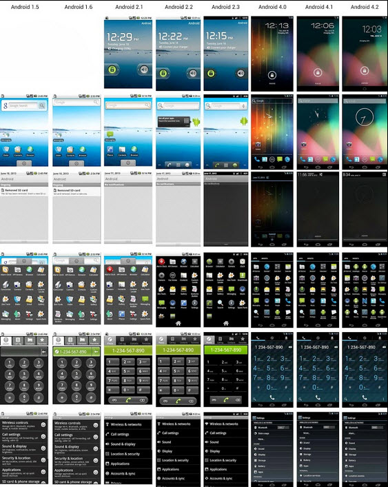 สำหรับระบบปฏิบัติการ Android เรียกได้ว่ามีการเติบโต ที่รวดเร็วออกมากๆ ในช่วง 1-2 ปีที่ผ่านมา ขณะเดียวกันระหว่างการพัฒนา ก็ได้มีการเปลี่ยนแปลงรูปร่าง เมนู ไอค่อน พื้นฐาน ต่างๆบนตัวระบบปฏิบัติการมากมาย และได้มีผู้ที่รวบรวมลักษณะ UI ต่างๆของแต่ละ เวอร์ชั่น ของ Android นำมาเปรียบเทียบกัน ตั้งแต่ Android Cupcake ถึง Jelly Bean เลยทีเดียว
