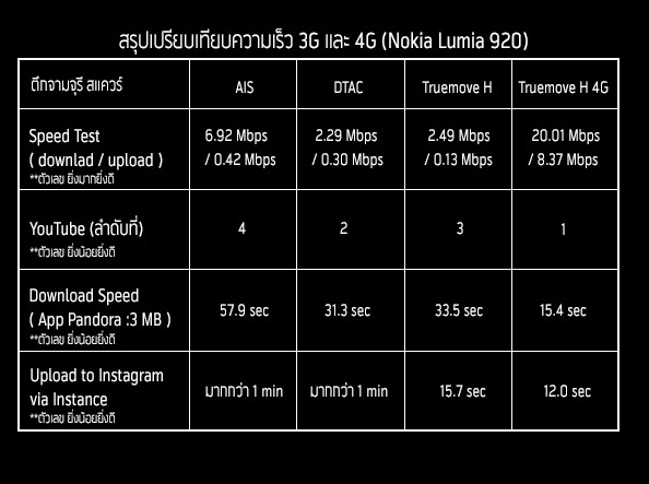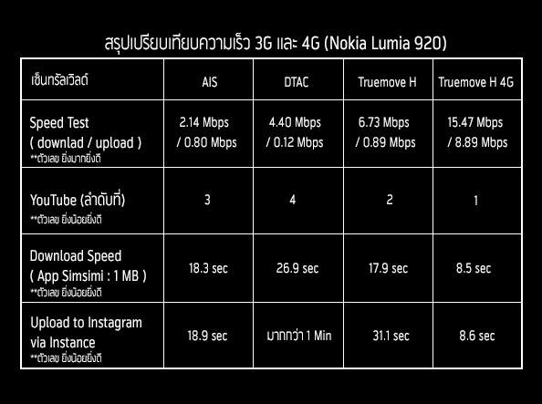 สรุปภาพรวมสำหรับการทดสอบที่เซ็นทรัลเวิลด์ ทางด้าน 4G ของ truemove H นั้นยังคงมีความโดดเด่นในด้านความเร็วที่ทิ้งห่าง 3G อยู่พอสมควรในทุกๆการทดสอบ ส่วน 3G ในการทดสอบ Speed test จะเห็นได้ว่า truemove H ค่อนข้างมีความโดดเด่นกว่า AIS และ dtac อย่างเห็นได้ชัด ในขณะที่ความเร็วทางด้านการดูคลิปวีดีโอ Streaming ผ่าน YouTube นั้น truemove H ทำได้ดีกว่าค่ายอื่นๆ อีกเช่นกัน ขณะที่ dtac จะมีความเร็วในการแสดงผลที่ค่อนข้างช้ากว่าอีก 2 เครือข่ายเล็กน้อย ทางด้านการดาวน์โหลดไฟล์ truemove H และ AIS ทำเวลาได้ใกล้เคียงกันมาก ส่วน dtac ยังคงรั้งท้ายอยู่เช่นเดิม สุดท้ายกับการอัพโหลดภาพไปยัง Instagram นั้น AIS ทำเวลาได้ดีที่สุด ตามมาด้วย truemove H และ dtac