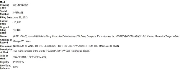 ทางค่าย Sony ได้ยื่นเรื่องขอจดทะเบียน PlayStation TV กับทางสำนักงานจดสิทธิบัตรและเครื่องหมายการค้าของสหรัฐอเมริกาเมื่อช่วงปลายเดือนมิถุนายนที่ผ่านมา ซึ่งดูแล้วน่าจะเป็นบริการคล้ายๆกับของ Netflix