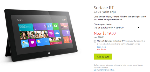 ล่าสุดเป็นอย่างที่ข่าวลือออกมาก่อนหน้านี้แล้ว ทาง Microsoft ได้มีการประกาศลดราคาขายของ Surface RT บน Microsoft Store ลงอย่างที่ข่าวลือออกมาที่ 150 เหรียญ ซึ่งทำให้ตัวเครื่องในรุ่น 32 GB มีราคาเหลือเพียง 349 เหรียญ หรือประมาณ 10,900 บาท และ 64 GB มีราคาเพียง 449 เหรียญ หรือประมาณ 14,000 บาท ขณะที่อุปกรณ์เสริมอย่าง Touch Cover กับ Type Cover ยังมีราคาอยู่ที่ 100 เหรียญ หรือราว 3,100 บาท ขึ้นไปตามปกติ