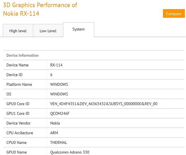 แต่ล่าสุดได้มีการปรากฏขึ้นของแท็บเล็ตจาก Nokia ที่มาพร้อมระบบปฏิบัติการ Windows ภายใต้โค้ดเนม RX-114 ซึ่งได้มีการปรากฏข้อมูลสเปคของตัวเครื่องขึ้นบนเว็บไซต์ทดสอบ Benchmark อย่าง GFXBench