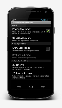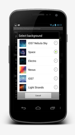 สำหรับแอพลิเคชั่นนี้มีชื่อว่า 3D Parallax Background ซึ่งจะช่วยให้ผู้ใช้งานสามารถใช้งานความสามารถในลักษณะ Live Wallpaper ได้เหมือนกับที่มีอยู่บน iOS 7 โดยที่ผู้ใช้งานขยับหน้าจอเอียงไปทางใดก็ตาม ภาพพื้นหลังก็จะขยับตาม