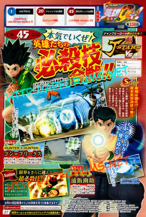 จากรายงานล่าสุดของนิตยสาร Jump ในสัปดาห์นี้คอนเฟิร์มแล้วว่า Namco Bandai ได้เตรียมเพิ่ม 2 ตัวละครใหม่อย่าง Gon Freecss จากเรื่อง Hunter x Hunter และ Yusuke Urameshi จากเรื่อง YuYu Hakusho สองผลงานยอดนิยมของอาจารย์ Yoshihiro Togashi มาเข้าร่วมในศึก J-Stars Victory ครั้งนี้ด้วย เริ่มน่าสนใจขึ้นเรื่อยๆซะแล้วซิกับเกมแนว Fighting รวมมิตรตัวละครดังเกมนี้