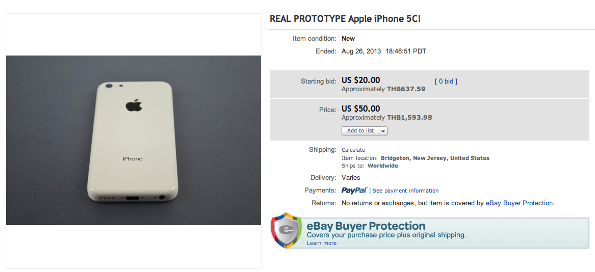 อย่างไรก็ตามจากราคาของการประมูลชิ้นส่วนฝาหลัง iPhone 5C สีขาวนี้ ณ.ปัจจุบัน ( 27 ส.ค. 13 ) ได้มีมูลค่าที่ถูกประมูลไปแล้วถึง $285 หรือประมาณ 9,000 บาท ซึ่งมีความเป็นไปได้ที่ราคาประมูลอาจสูงขึ้นไปอีกเรื่อยๆ โดยการประมูลจะสิ้นสุดลงภายในวันที่ 30 ส.ค. นี้