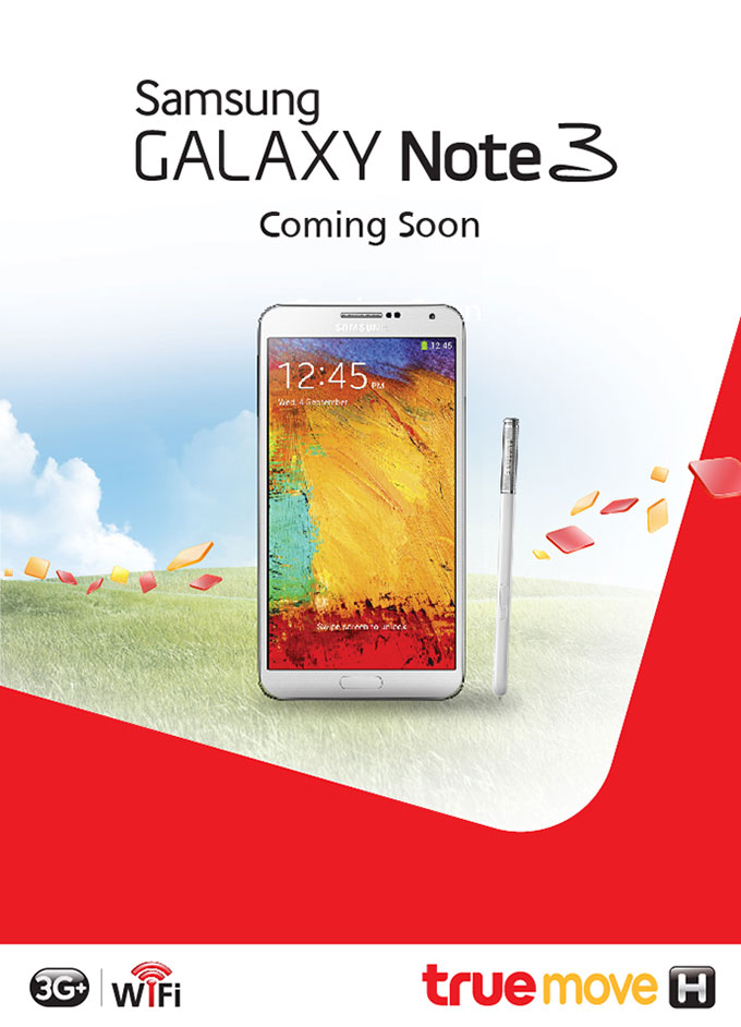 ทันทีที่ Sasmung เปิดตัว Galaxy Note 3 อย่างเป็นทางการค่าย TrueMove H ประกาศผ่านหน้า Facebook ทันที “เตรียมพบกับ TrueMove H Samsung Galaxy Note 3 เร็วๆนี้” ติดตามข่าวสารเพิ่มเติมได้ที่ www.truemove-h.com/samsung/note3 คาดว่าน่าจะเริ่มมีการให้เปิดจองออนไลน์ในเร็วๆ เพราะตัวเครื่องวางจำหน่ายในประเทศไทยทางการช่วงปลายเดือนนี้ถึงต้นเดือนหน้า และยังคงไม่มีการเปิดเผยราคาทางการ