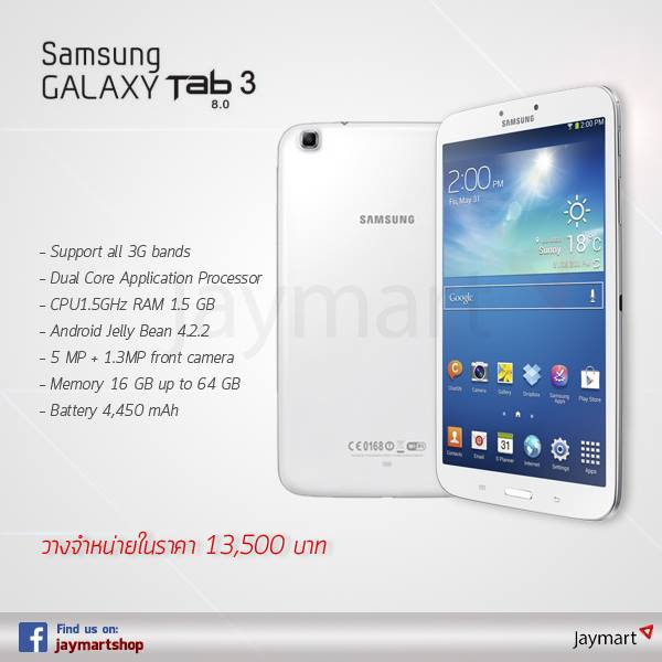 หลังจากที่ Samsung ได้วางจำหน่าย Galaxy Tab 3 รุ่น 7 นิ้วและ 10.1 นิ้วไปแล้ว ล่าสุดก็วางจำหน่ายรุ่นหน้าจอ 8 นิ้วเพิ่มมาอีกรุ่นแล้ว ที่มีความเพรียวบาง ขนาดพอเหมาะ จับกระชับมือ โดยทาง Jaymart ก็ได้วางจำหน่ายในราคา 13,500 บาท